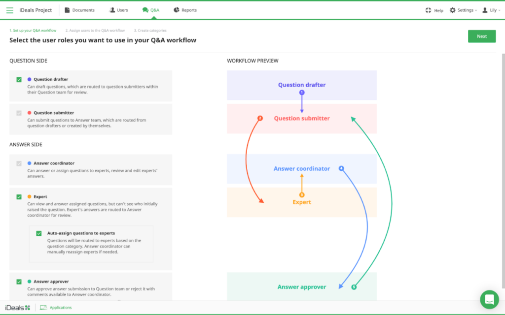 Pas tous les VDRs vous proposent cette fonctionnalité, mais si le vôtre en est un, profitez-en et activez-la. Avec les Questions/Réponses, vous pouvez centraliser toute la communication qui a lieu autour des informations partagées dans votre salle de données. Vous gagnez du temps en attribuant les questions des utilisateurs aux bonnes personnes dans votre équipe, et en partageant publiquement leurs réponses.